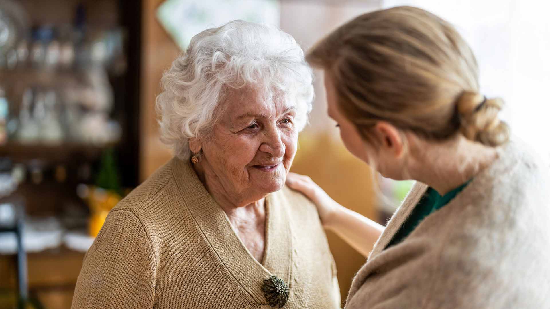 A young woman gently holds hands with an older woman outdoors in a garden, both wearing light-colored shirts and smiling warmly at each other.